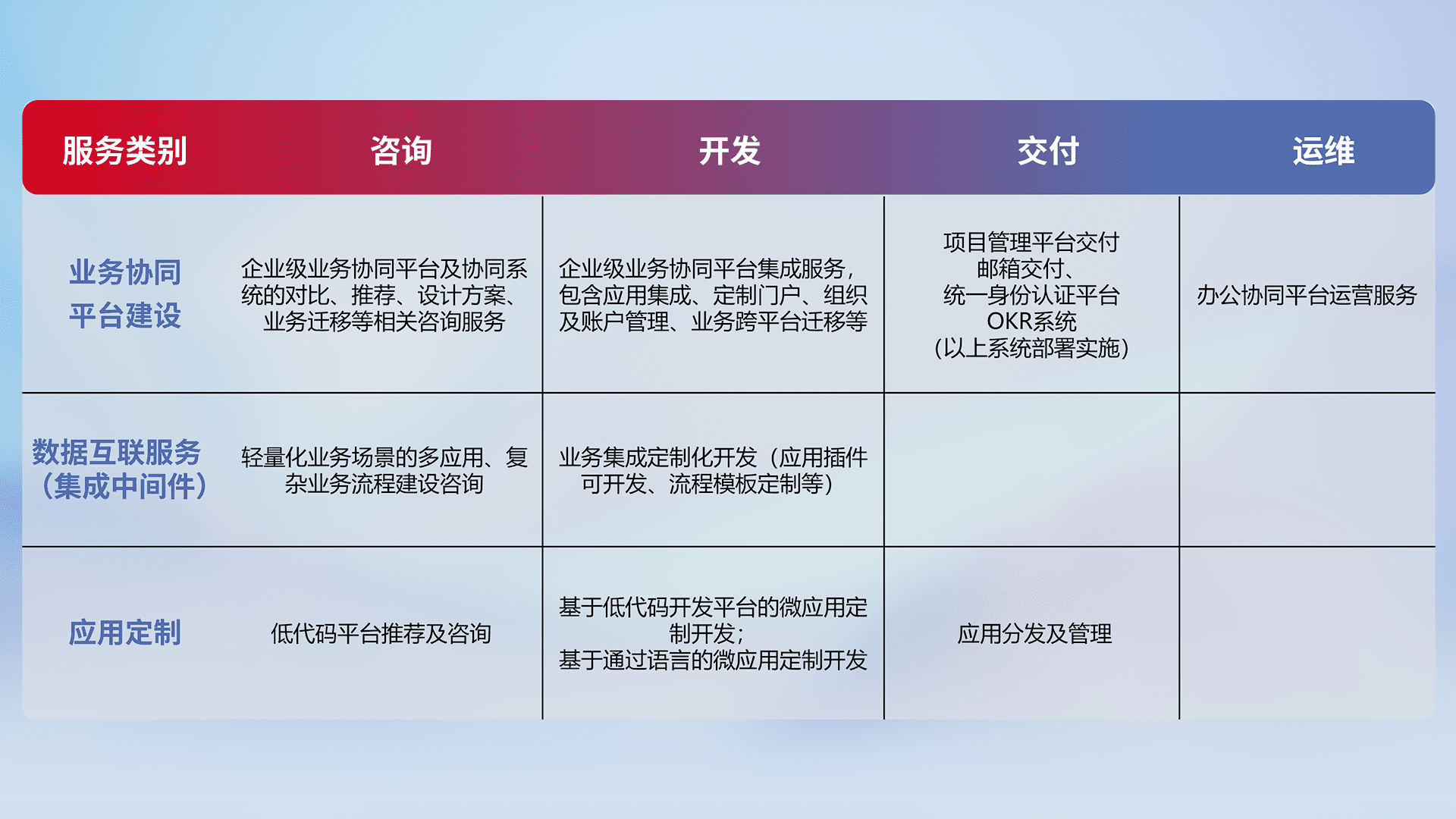 基于全代码低代码的数字化应用系统开发及交付,,,,满足特定业务场景的应用开发及集成,,,,提升企业业务信息化及数字化能力。。